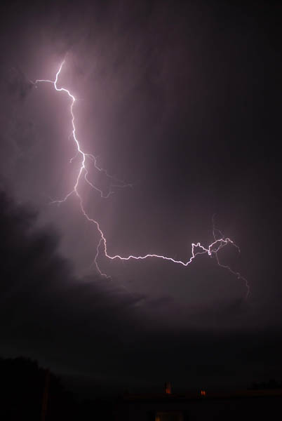August 1, 2009: We've been under the weather, here--colds are going around. Apparently, Oklahomans can't take weather in the 80s and rain in July. It's been a crazy weather pattern the last week or two, rather like (*gasp*) Maine, only 10 degrees warmer. There were some impressive thunderstorms here recently, and I actually figured out how to take some lightning pictures. I went with a 2 second exposure, ISO 200, and f9.0 aperature. A few bolts were so bright they washed out the photo, but I got quite a few good ones. Here are a couple: