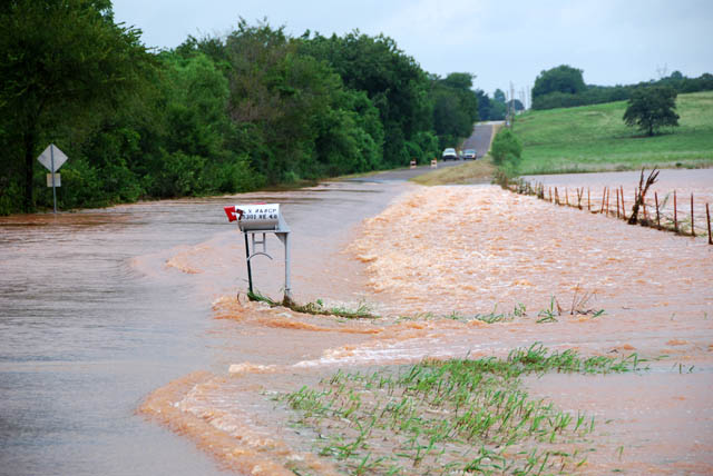 Little River valley and Franklin Road at about 3PM, soon after Little River crested. The river is normally about 8 feet wide and less than a foot deep up here near the headwaters, and confined to the bottom of the gully. Toby Keith's land is to the left of the road.