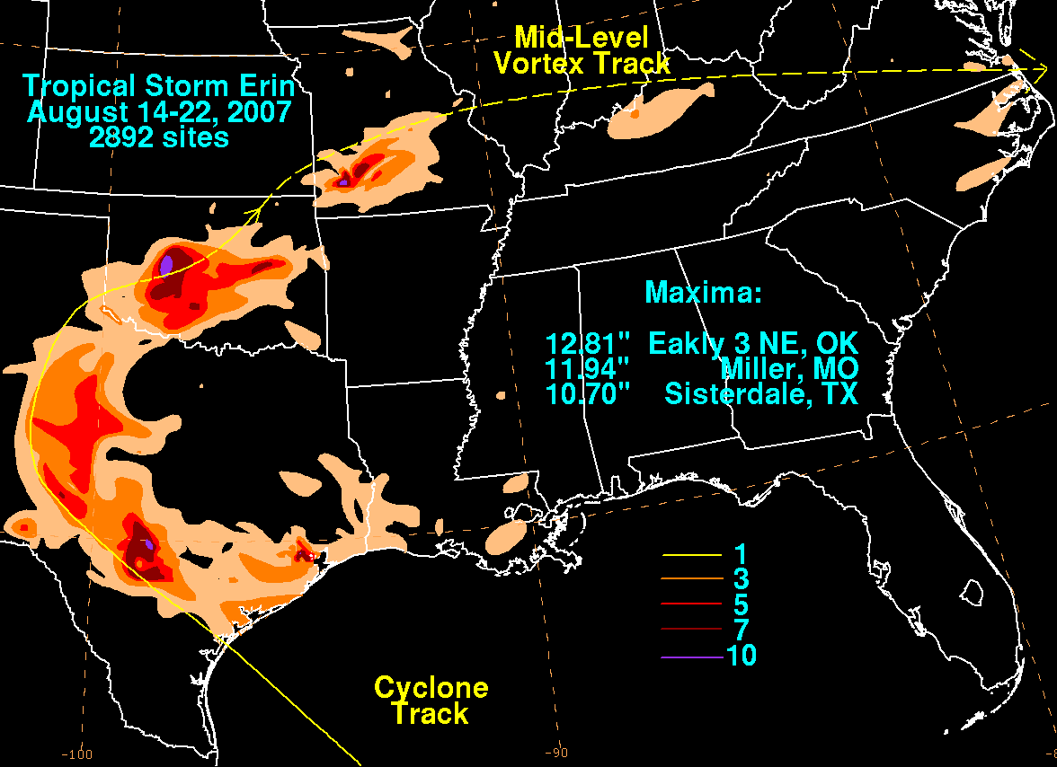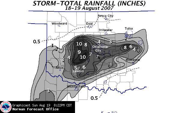On August 18th and 19th, 2007, a surprising storm hammered central Oklahoma. Tropical Storm Erin made landfall at Corpus Christi, Texas on August 16th, bringing severe flooding to that area. It dissipated for the most part after landfall, and curved across west Texas. The remnants of the storm started moving into Western Oklahoma on August 18th. And an amazing thing happened. The totally disorganized storm reorganized itself, strengthening as if it was over open and hot ocean. The reasons for the storm "bombing" will probably be discussed for a long time; it has almost never happened that a tropical system strengthened over land.