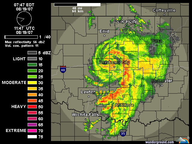 At 8:00 AM, the storm was centered over Edmond (north of OKC) and was just reaching the end of its highest-intensity time.