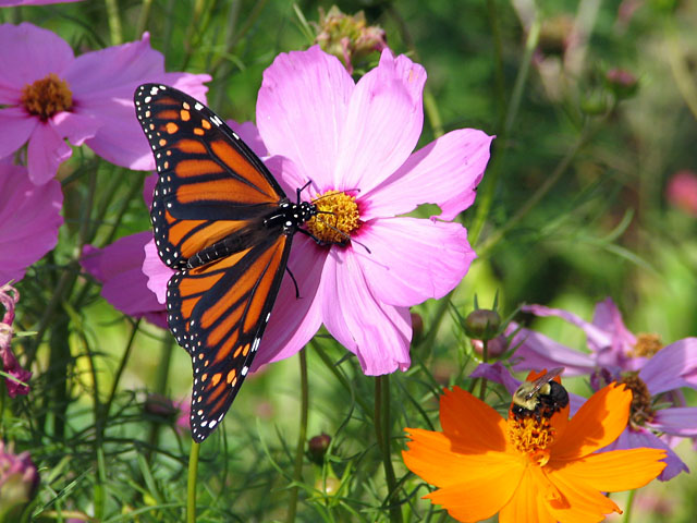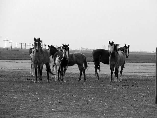 The flower photo came from our front flower bed--it was the only one of Sarah's Gladiolus to come up and flower. The photo of the Monarch butterfly and the bumblebee was taken last October in our flower/vegetable garden out back. I got quite a few photos of the Monarch, and several with the bumblebee. The photo of the horses came on a trip to Kansas in March to my great uncle's 60th wedding anniversary. The horses were across the street from his house. Note how flat the area is, and old telegraph lines in the distance. The still life photo was also taken up there in Modoc, Kansas, home of some 15 people I would guess. That was taken about 150 yards from his house. Quite picturesque in one sense, though it was a rather grey and incredibly windy day (thus no color photos). There aren't any hills to block the wind within a hundred miles, I would guess. And almost no trees outside of the towns.