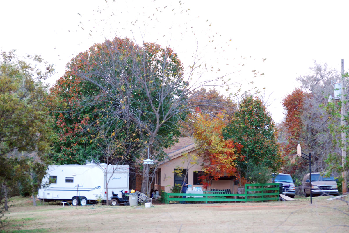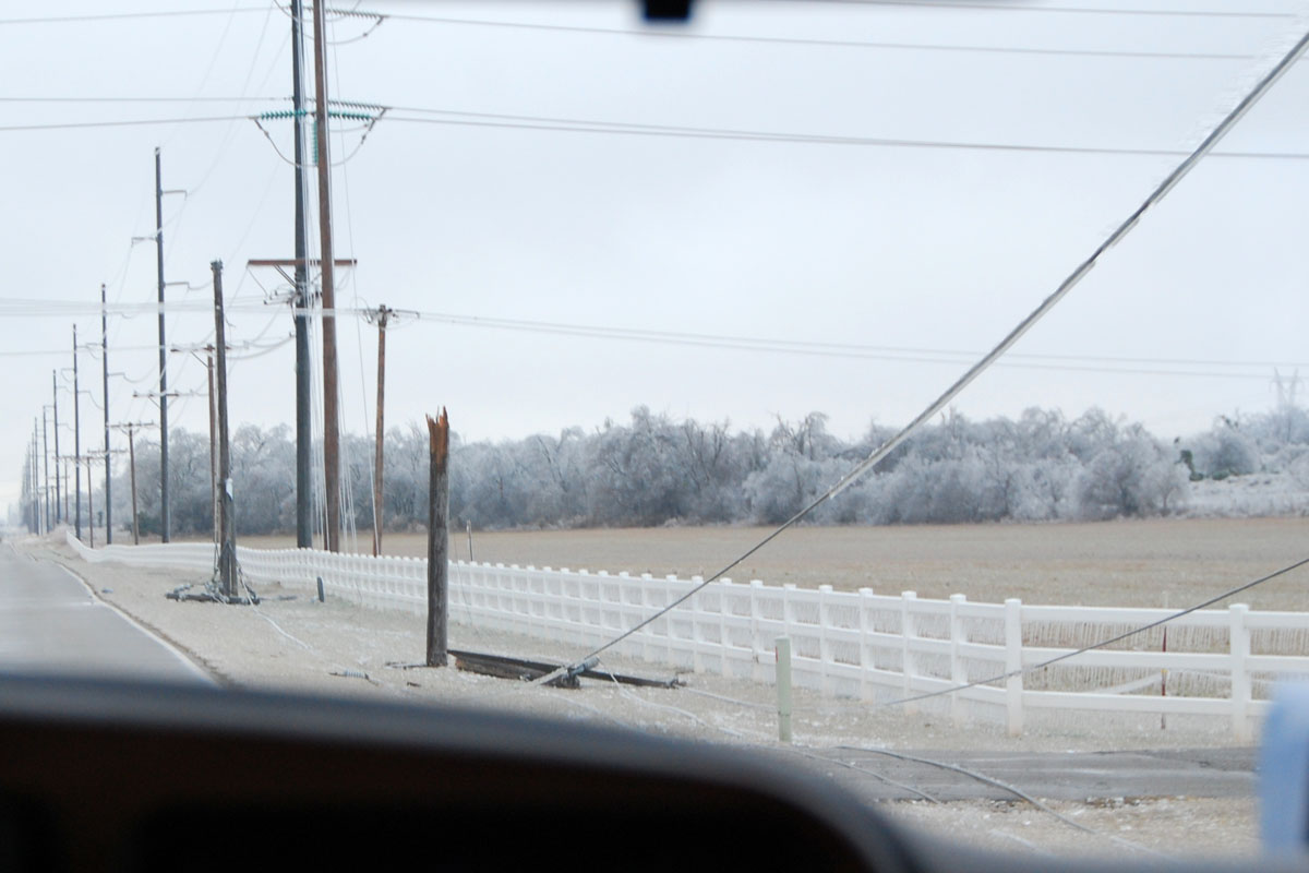 Ice Storm December 2007This page contains photos of the damage wrought by the ice storm in central Oklahoma of December 9th and 10th, 2007. A radar loop of the storm, from the Weather Underground archives (1.8mb): Significant freezing rain fell over almost 2 days, totalling well over an inch of rain--about 3/4" accumulated on our exposed surfaces here in Norman (just above Noble on that map). Photos of the DamageFirst, a before and after photo of the back yard: Before the storm (by about a month) After the storm, but before all of the branches fell. Many are already down. The final damage. The hackberry, to the left (I think that is what it is--or was), and the mature Bradford Pear (in the center) lost nearly all of their branches. The smaller trees fared better. More Photos of the Damage: Part of the front yard after the storm took down many branches--the elms along the fence lost most of their branches. Our road, with broken trees lining it. This was taken after the city came along and got most of the branches off our road. On the way to town, with several power poles down. As of the 15th, they were still not repaired (5 days after the storm). In town, the Bradford pears were devestated, mostly because they were still holding their leaves. Our road in a different location, still blocked by a (nearly) downed tree. Finally--the ice wasn't all bad. It was really quite beautiful, and pictures do not do it justice. But here is one, of our budding Carolina Jessamine out in the front yard. The flowers in bloom didn't hold up as well to the ice.