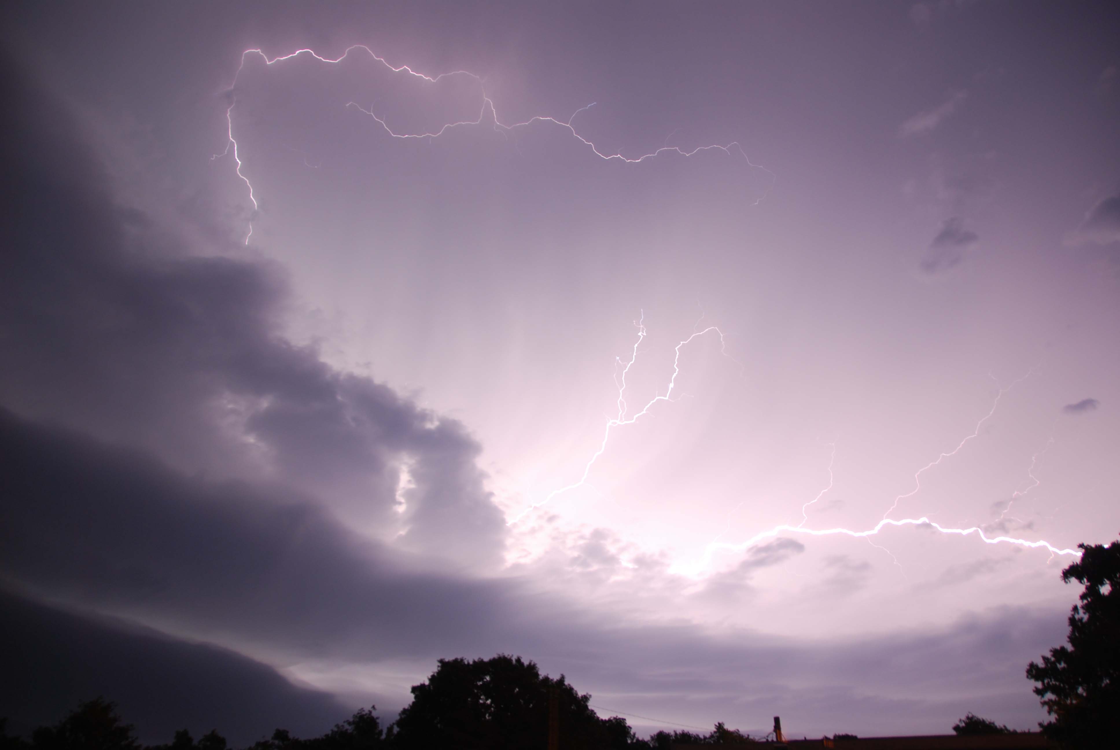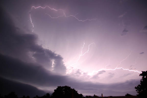 August 1, 2009: We've been under the weather, here--colds are going around. Apparently, Oklahomans can't take weather in the 80s and rain in July. It's been a crazy weather pattern the last week or two, rather like (*gasp*) Maine, only 10 degrees warmer. There were some impressive thunderstorms here recently, and I actually figured out how to take some lightning pictures. I went with a 2 second exposure, ISO 200, and f9.0 aperature. A few bolts were so bright they washed out the photo, but I got quite a few good ones. Here are a couple: