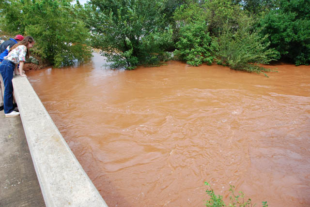 Little River a few blocks from our home. The water is flowing in what normally is a gorge some 40 feet wide and as many deep. Now, the water is within 3 feet of the girders on the bridge, and is overflowing to fill much of the valley.