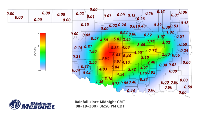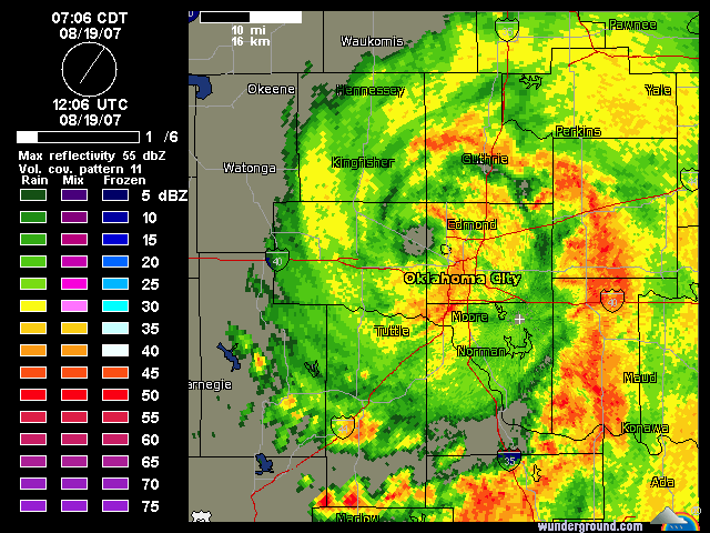 On August 18th and 19th, 2007, a surprising storm hammered central Oklahoma. Tropical Storm Erin made landfall at Corpus Christi, Texas on August 16th, bringing severe flooding to that area. It dissipated for the most part after landfall, and curved across west Texas. The remnants of the storm started moving into Western Oklahoma on August 18th. And an amazing thing happened. The totally disorganized storm reorganized itself, strengthening as if it was over open and hot ocean. The reasons for the storm "bombing" will probably be discussed for a long time; it has almost never happened that a tropical system strengthened over land.