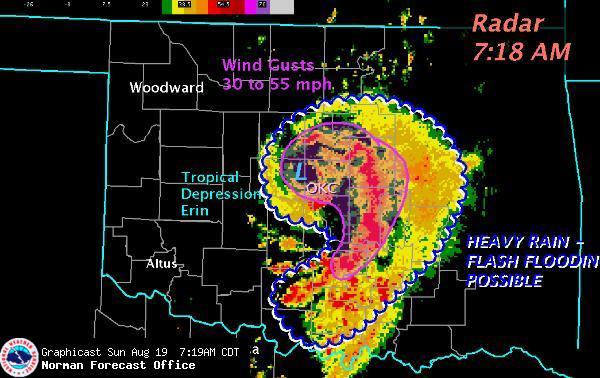 Weather Synopsis...A rare and extraordinary event is unfolding this morning as the rejuvinated remnants of Tropical Storm Erin move across central OK. Very heavy rainfall and potentially life-threatening flooding will be the main concern. Winds of 30 to 40 mph, and gusts above 50 mph, also will also be likely. Conditions will improve later today from west to east, as the storm moves into eastern OK. The good news is that the clouds and rain will take the edge off of the summer heat. Most of OK and north TX will stay in the 80s today.