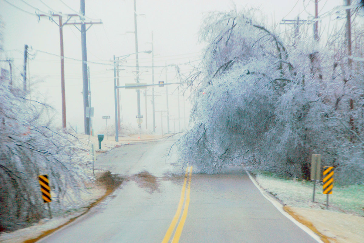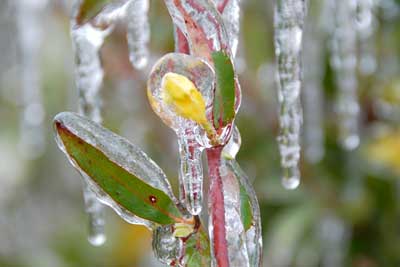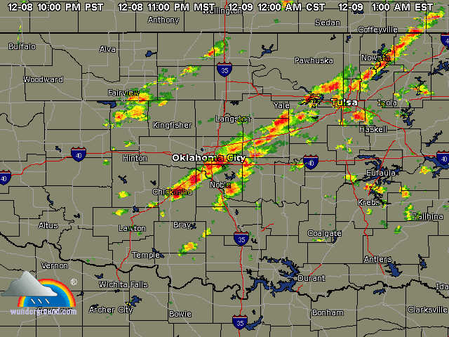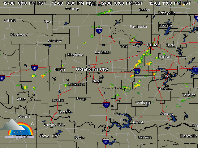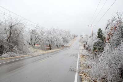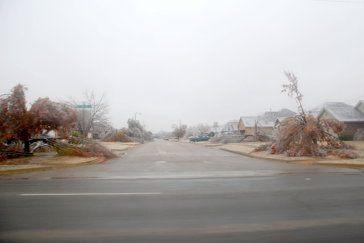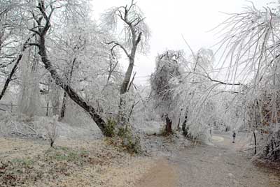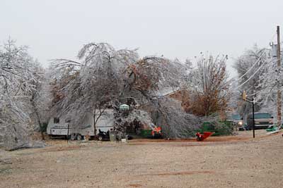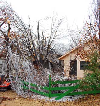 Ice Storm December 2007This page contains photos of the damage wrought by the ice storm in central Oklahoma of December 9th and 10th, 2007. A radar loop of the storm, from the Weather Underground archives (1.8mb): Significant freezing rain fell over almost 2 days, totalling well over an inch of rain--about 3/4" accumulated on our exposed surfaces here in Norman (just above Noble on that map). Photos of the DamageFirst, a before and after photo of the back yard: Before the storm (by about a month) After the storm, but before all of the branches fell. Many are already down. The final damage. The hackberry, to the left (I think that is what it is--or was), and the mature Bradford Pear (in the center) lost nearly all of their branches. The smaller trees fared better. More Photos of the Damage: Part of the front yard after the storm took down many branches--the elms along the fence lost most of their branches. Our road, with broken trees lining it. This was taken after the city came along and got most of the branches off our road. On the way to town, with several power poles down. As of the 15th, they were still not repaired (5 days after the storm). In town, the Bradford pears were devestated, mostly because they were still holding their leaves. Our road in a different location, still blocked by a (nearly) downed tree. Finally--the ice wasn't all bad. It was really quite beautiful, and pictures do not do it justice. But here is one, of our budding Carolina Jessamine out in the front yard. The flowers in bloom didn't hold up as well to the ice.